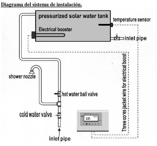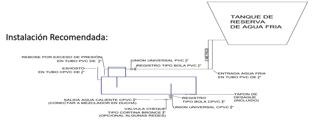 - recomendado: válvula mezcladora en la salida de agua caliente que va a la ducha para controlar temperatura